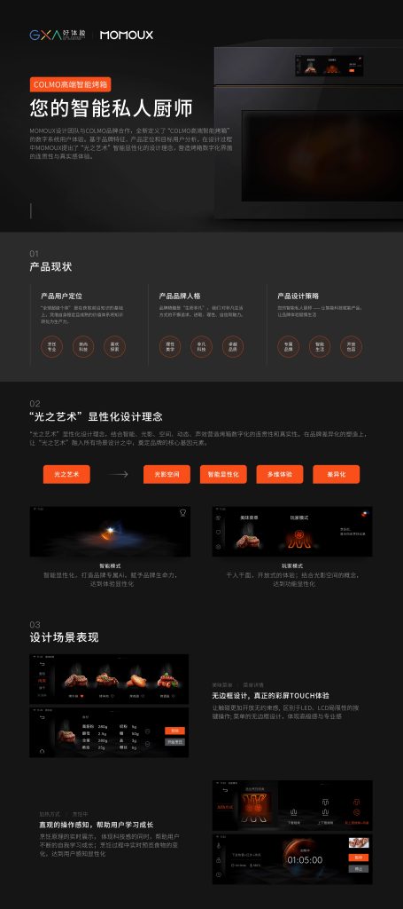 COLMO品牌是聚集美的综合性的优势、承载着美的集团提升全球化高端市场占有率的愿景,品牌核心人群定位为“全球超级个体”,COLMO智能产品将帮助完成和规划日常生活中琐碎的事情,解决生活中复杂穿插的场景化问题,更好的完成自身价值。数字化部分是产品整体解决方案中的关键感知触点,COLMO提出全新设计一套符合品牌定位并具有差异化的数字化系统,以COLMO烤箱为设计载体,完成数字系统的整体交互设计和视觉设计规范。 MOMOUX设计团队基于全局融合体验设计思维的指导,从品牌定位和目标用户生活场景研究开始,探索数字化体验设计的机会点。通过前期的研究,我们提出“光之艺术”显性化的设计理念,打造独特的COLMO品牌数字系统设计语言,坚持品牌所倡导的自然交互和理性美学的设计原则,全新的数字系统设计方案改变了烤箱以往操控不直观、烹饪过程不可感知等体验缺陷,通过光影、动态和声音的融合设计让烹饪操作过程不再枯燥。