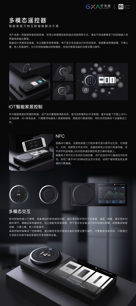 赵业:模块化交互方案创新,如实现多产品控制真正的集成有机会成为家庭控制中心,可解决实际生活场景问题,具备前瞻性,有一定的价值性,设计品质感较好;实际使用中交互细节,如增加设备关联等的面向老人和儿童群体的易用性需要更多考量;