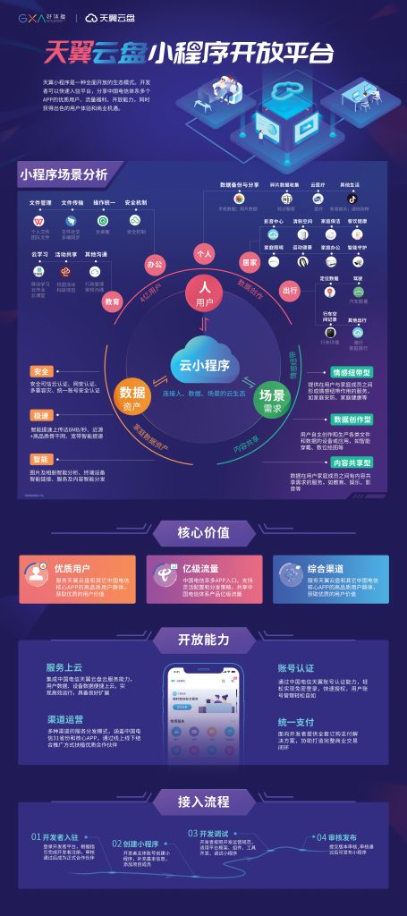 天翼云盘小程序是一种全面开放的生态模式。开发者可以快速入驻平台,分享中国电信体系多个APP的优质用户、流量 福利、开放能力,同时获得出色的用户体验和商业机遇。优质的用户群、中国电信体系的亿级流量、丰富的合作伙伴扶植渠道共同组成天翼云盘小程序生态圈的核心价值。合作伙伴通过简单的一点式接入,就可以进入小程序生态全流量矩阵,共享优质的渠道和用户。天翼云盘小程序将与合作伙伴一同创造更大的商业价值。