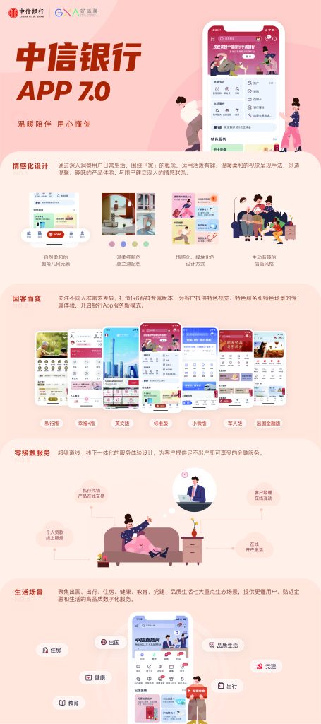 中信银行APP7.0版本秉持“以客为尊”、“信守温度”的服务理念,以“温暖陪伴、用心懂你”为体验策略,通过深入洞察用户日常生活,围绕「家」的概念,关注用户从自我到家庭的需求延伸,为用户提供温暖随行的“陪伴式服务”。基于生活场景进行情感化、模块化设计,创新采用莫兰迪配色、插画风格、圆角设计等元素,创造温馨、趣味的产品体验,从而与用户建立深入的情感联系。“1+6”专属客群服务新模式,关注不同人群需求差异,以标准版本为基础,增加6个专属版本,为出国金融客群、老年客群、高净值客群、小微业主、军人和外籍人士,提供特色视觉、服务和新场景体验。金融服务零接触,打通业务壁垒,优化服务流程,提供超越渠道、灵活快捷的线上线下一体化服务模式,为客户提供足不出户即可享受的金融服务。聚焦7大生活场景,出国、出行、住房、健康、教育、党建、品质生活……结合智慧运营中台系统,构建完整、及时、一致的客户统一视图,提供个性化。