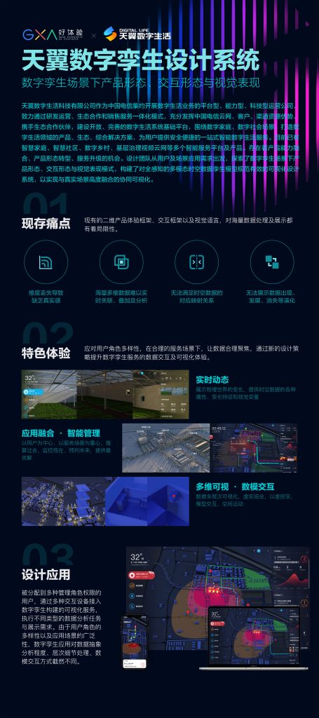 天翼数字生活科技有限公司作为中国电信集约开展数字生活业务的平台型、能力型、科技型运营公司,致力通过研发运营、生态合作和销售服务一体化模式,充分发挥中国电信云网、客户、渠道资源优势,携手生态合作伙伴,建设开放、完善的数字生活系统基础平台,围绕数字家庭、数字社会场景,打造数字生活领域的产品、生态、综合解决方案,为用户提供安全便捷的一站式智能数字生活服务。目前已有智慧家庭(到达用户1.4亿+)、智慧社区(签约小区2万+)、数字乡村(覆盖行政村30万+)、基层治理视频云网(行业平台接入设备500万+)等多个智能服务平台及产品。存在着产品能力融合、产品形态转型、服务升级的机会。设计团队从用户及场景应用需求出发,探索了数字孪生场景下产品形态、交互形态与视觉表现模式,构建了对全感知的多模态时空数据孪生模型规范有效的可视化设计系统,以实现与真实场景高度融合的协同可视化。