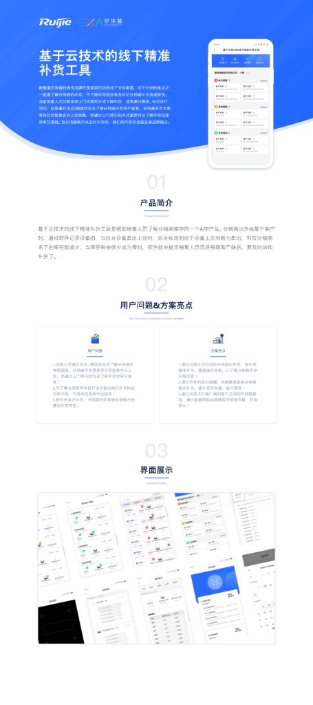 数据通讯领域的很多品牌还是采用传统的线下分销渠道,线下分销的难点之一就是了解分销商的库存,不了解库存就没有及时给分销商补货造成损失。当前销售人员只能采用上门查看的方式了解库存,或者通过微信、电话进行询问,但是通过电话/微信的方式了解分销商库存并不容易,分销商并不太愿意将经营信息告诉上级销售,而通过上门拜访的方式虽然可以了解库存但是效率又很低。当分销商缺货未及时补货时,他们的库存被友商品牌侵占的情况也时有存在。 基于云技术的线下精准补货工具是帮助销售人员了解分销商库存的一个APP产品。分销商出货给某个客户时,通过软件记录设备ID,当这台设备卖出上线时,后台检测到这个设备上云判断为卖出,对应分销商名下的库存数减少,当库存剩余很少或为零时,软件就会提示销售人员该经销商客户缺货,要及时给他补货了。