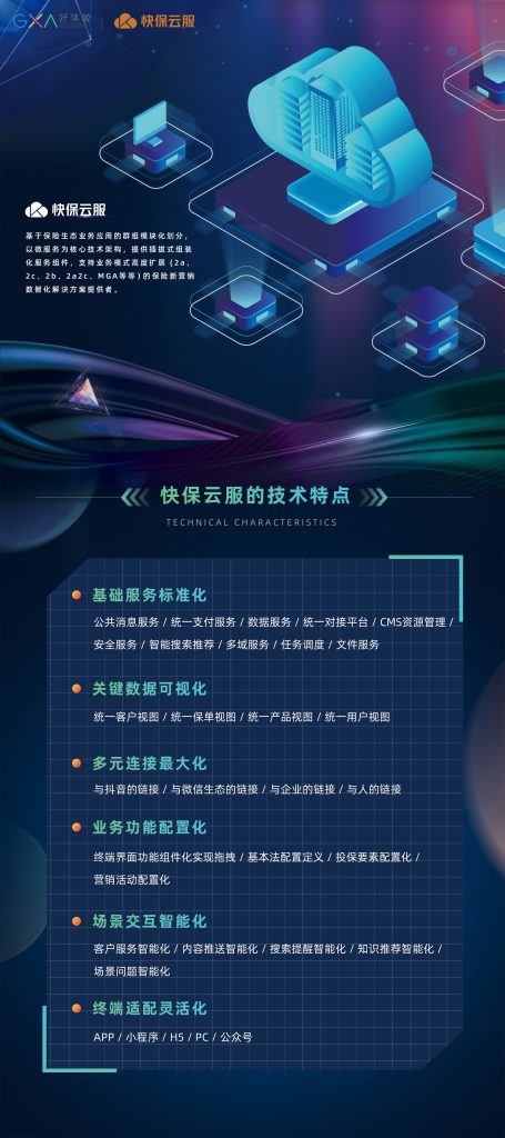 快保云服技术是:基于保险生态业务应用的群组模块化划分,以微服务为核心技术架构,提供插拔式组装化服务组件,支持业务模式高度扩展 (2a、2C、26、2a2C、MGA等等)的保险新营销数智化解決方案提供者。