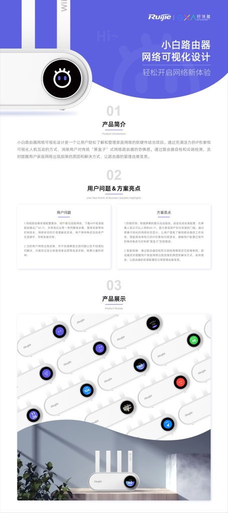 小白路由器网络可视化设计是一个让用户轻松了解和管理家庭网络的软硬件结合项目。通过充满活力的IP形象和可视化人机互动的方式,消除用户对传统“黑盒子”式网络路由器的恐惧感。通过路由器自检和云端检测,及时提醒用户家庭网络出现故障的原因和解决方式,让路由器的管理由难变易。