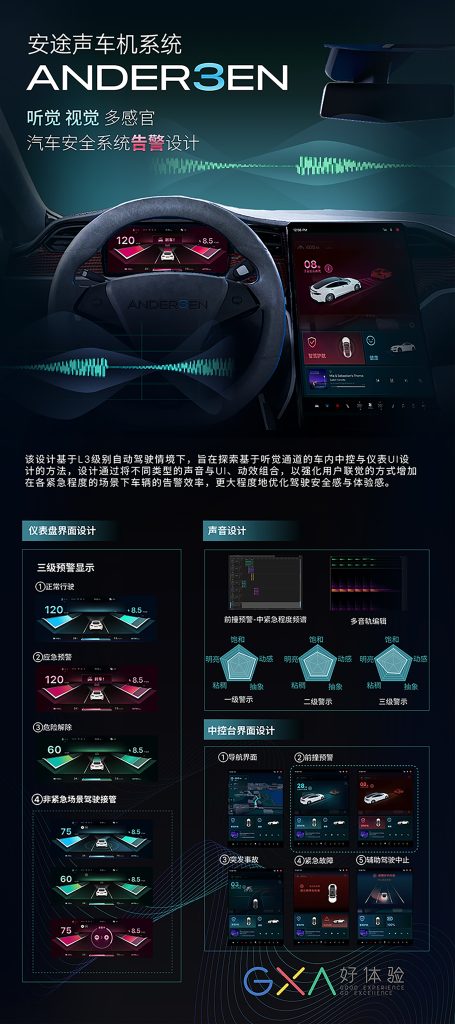 陈江:该设计基于L3级别自动驾驶情境下,旨在探索基于听觉通道的车内中控与仪表告警设计的方法,设计通过将不同类型的声音与UI、动效组合,以强化用户联觉的方式增加在各紧急程度的场景下车辆的告警效率,更大程度地优化驾驶安全感与体验感。