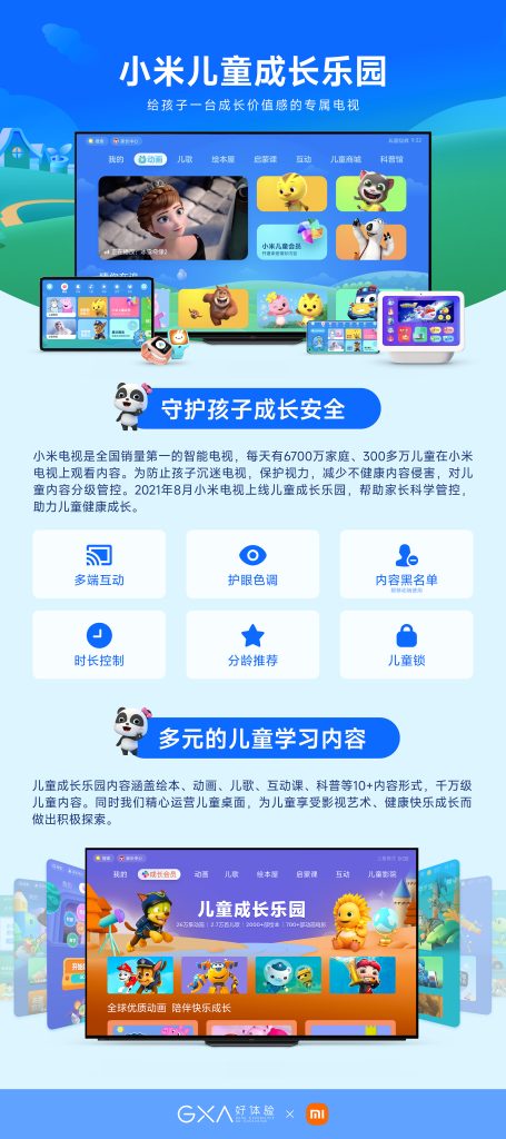 小米电视是全国销量第一的智能电视,每天有6700万家庭、300多万儿童在小米电视上观看内容,过去数年,随着小米电视内容不断丰富,家长对儿童观影安全的关注越来越高。为了防止孩子沉迷电视,保护孩子视力,减少不健康内容对儿童的侵害,2021年8月小米电视上线了儿童成长乐园,成长乐园提供了儿童锁、时长管理等功能,家长可以设置开机自启动,一键进入成长乐园,帮助家长解决如何科学管控孩子看电视等难题。 0-12岁的儿童正处于儿童心理发展最重要的时期,为保证孩子们健康成长,我们对儿童内容做了内容分级和管控,儿童频道也从单一动画内容扩充至涵盖绘本、互动课、科普、英语等10+具有成长价值的内容形式,小米电视也为家长用户提供了各种实用工具,帮助家长科学把控孩子观看电视的范围、时长,还能让家长在忙碌工作的同时不错过孩子的成长瞬间,丰富亲子话题,拉近家长和孩子的距离,帮助建立情感链接。