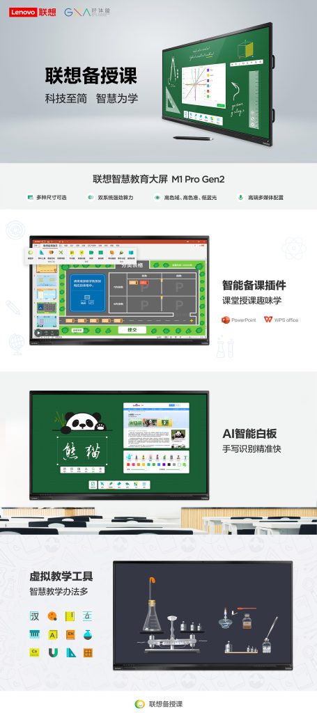 联想备授课教学系统搭载在联想智慧教育大屏上作为一体化解决方案为教师服务,软件安装后可在Office/WPS PPT中使用智能备课助手,内置丰富的AI智慧化工具如古诗词、虚拟实验等,会用PPT就能上手,0门槛备课;采用最佳动线设计提升教学效率,授课时随手唤起板中板写批注,不遮挡教学内容,拟物化的笔刷模拟粉笔、竹笔等真实效果,无障碍授课;智慧大屏内容高度可以基于不同身高自适应调节,满足教学教师和学生不同身高差异。拿起特有的智能笔可对快速唤起手写内容实时识别,转换为字卡、函数曲线、可编辑的图形、化学方程式。New Flat 设计语言充分为用户体验考虑,体现为内容一步触达:聚类快捷内容,快速定位目标内容;任务一目了然:任务驱动型交互布局,解决内容和任务分散的问题;界面一见倾心:营造视觉冲击力,具备吸引力和传播性。方案解决了地区间教育资源不均衡,用人工智能辅助教学,目前已在全国2000余所学校部署。