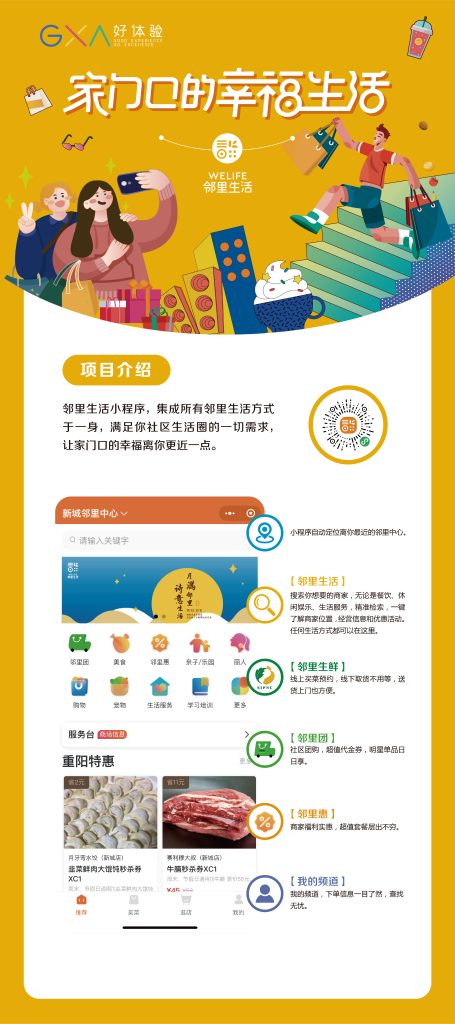 邻里生活Welife小程序是邻里中心面向一刻钟便民生活圈提供的本地生活服务平台。 邻里中心是一刻钟便民生活圈的苏州范式,是属地街坊的生活服务中心,服务3-5公里内的居民,邻里生活平台实现了苏州工业园区数十个邻里中心以及数千家门店的在线化,覆盖园区百万人口。 街坊邻里(我们的用户)可以很方便地通过邻里生活平台浏览商场活动、商家信息和优惠、手机买菜网订店取或配送到家服务。邻里生活平台按52周MD来做全年用户运营和生意企划,先后推出邻里生活55购物节和邻里生活78购物节,取得了不错的成绩,平台目前已累计用户数超80万,近十二个月平均DAU大于两万。 我们自主实现了在地商业的数字化,项目以邻里生活Welife小程序为用户端,以邻里商家工作台小程序为商家端,以邻里商业工作台PC端为商场管理端,实现了CBA一体化的数字化商业体系。助力商家实现数字化经营,更好地串联本地商业人货场。