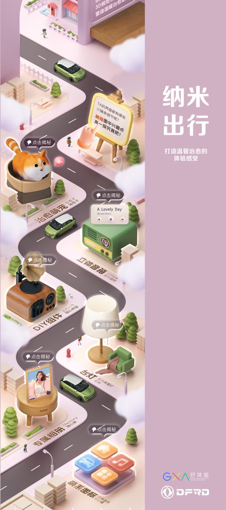 该作品通过三维视觉效果,打造萌态交互,并将车内场景与家庭、家居场景相结合,体现出行生活一体化的概念。