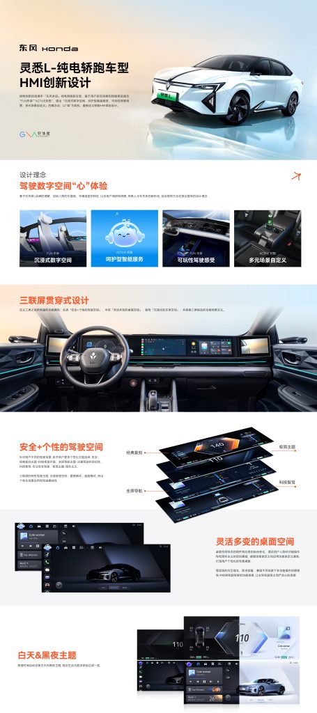 格物创新咨询携手「东风本田」纯电轿跑新车型,基于用户研究洞察和轿跑商品理念“FUN乐享”“ACTIVE积极”,提出「沉浸式数字空间、呵护型智能服务、可玩性驾驶场景、多元场景自定义」的概念点,以“飒”为契机,重新定义纯电轿跑HMI创新体验设计。 三联屏贯穿式设计, 定义三屏之间所侧重的功能属性:仪表「安全+个性的驾驶空间」、中控「灵活多变的桌面空间」、副驾「沉浸式的乐享空间」,并探索三屏联动的功能场景定义, 休闲空间的冥想模式, 户外生活的露营模式, 驾驶乐趣的超模模式。